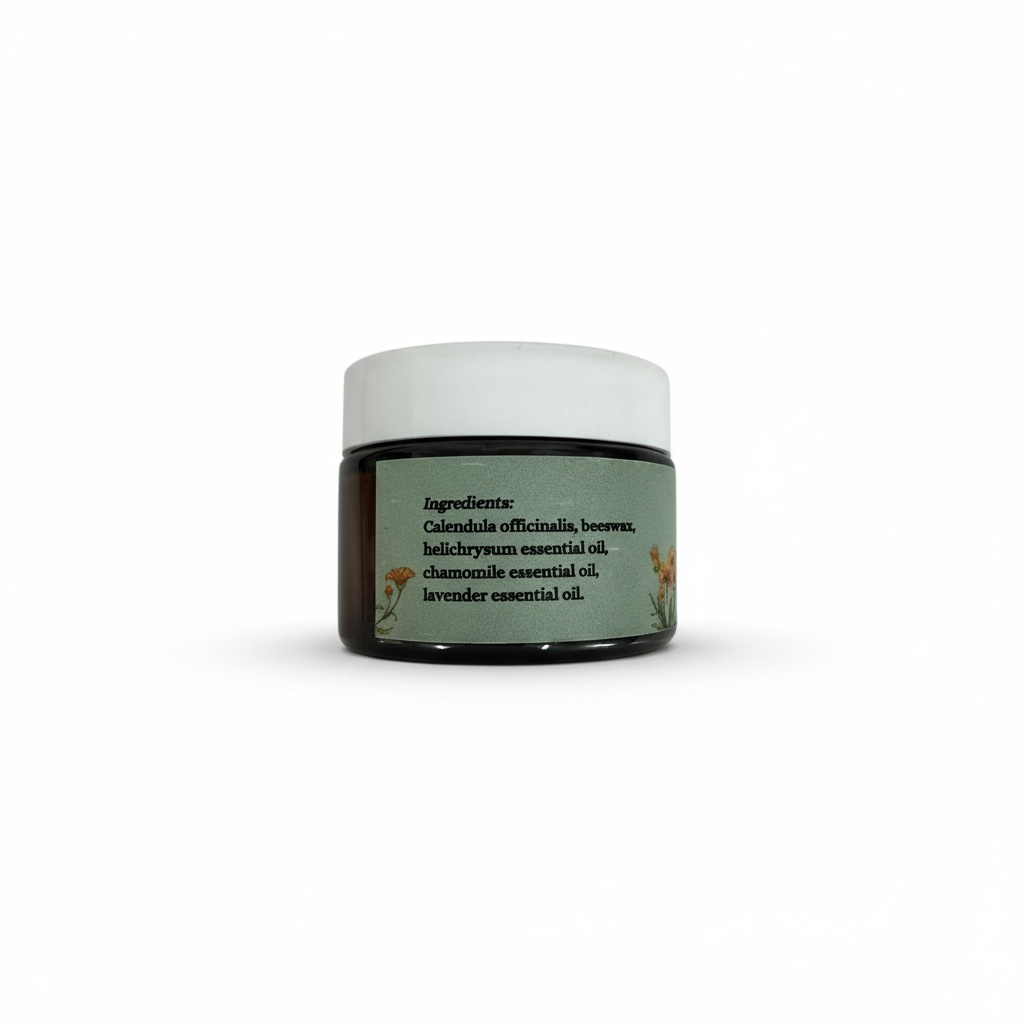 • Key Ingredient: Calendula Infusion: The balm is based on an oil (such as Olive, Sweet Almond, or Sunflower Oil) that has been infused with dried Calendula flowers, drawing out the flower’s beneficial compounds.